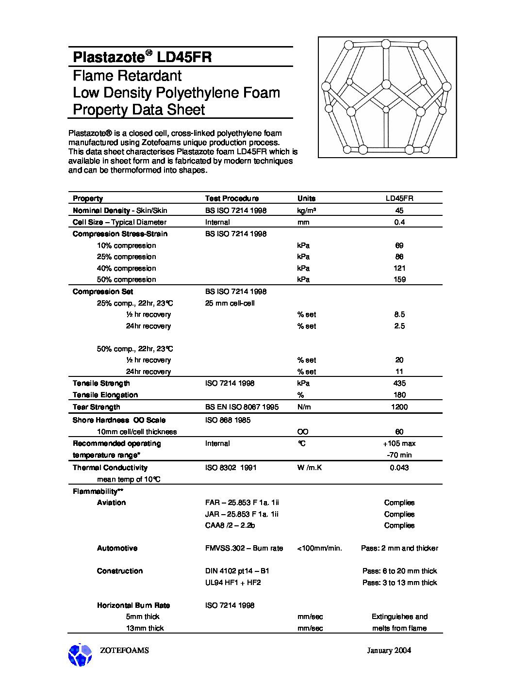 Plastazote LD45 Blue is a closed cell, cross linked and fire retardant polyethylene foam with a nominal density of 2.8 PCF / 45 kg/m³. Manufactured with “Zotefoam’s” unique chemical free nitrogen infusion process, producing an environmentally friendly product with low VOCs. Only available here in 2″ thick sheets only. With a cell size of 0.4 mm and a thermal conductivity of 0.042 W/m.K.